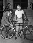Sergeant Frank Rainwater, is shown fastening a 1947 license plate to the bicycle of Bobbie McClendon. Sergeant Rainwater is the head of the Fort Worth Police Department's bicycle license division. He is preparing for the sale of 10,000 new tags, beginning Tuesday. He is dressed in a double breasted suit. Bobbie is the thirteen-year old owner of the bicycle. He is wearing a t-shirt and trousers. He is the son of Mr. and Mrs. Homer P. McClendon.