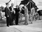 The American Airlines' Midnight Expediter, a flying post office, stopped in Fort Worth, Texas on a demonstration flight in connection with inauguration of the five-cent stamp service. Fort Worth's incoming and outgoing mail was taken to the plane's side in a stage-coach. The scene represents a century of progress for the United States Postal Service. Delivering the mail, left to right, are H. E. Coale, J. H. Wiseman, Fort Worth Mayor Roscoe Carnrike, and Henry Young. Mr. Coale is the divisional superintendent of the Railway Mail Service. He is dressed in a hat and a pinstripe suit. Mr. Wiseman is an American Airlines sales manager. He is dressed in a cowboy hat, button-up shirt, coat, trousers, and cowboy boots. Mayor Carnrike is wearing a hat and a double breasted suit. Mr. Young, Postmaster, is dressed in a hat and a suit. Published in the Fort Worth Star-Telegram evening edition, October 1, 1946.