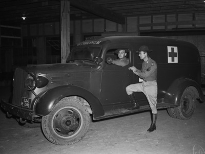 Whether there are any casualties in the summer "war" or not, there and other members of Ambulance Company of the One Hundred and Eleventh Medical Regiment will be on hand when the big troop movement converges in Louisiana. Shown with one of the fleet ambulances to be taken to the maneuvers are Rankin Tyson, ambulance driver, and Staff Sergt. W. B. Parker, assistant, both of Company D. They made a final check of all equipment Tuesday night. Tyson is seen inside the ambulance as Parker leans toward him with one leg propped against the vehicle.