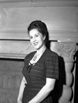 Mrs. Ana Donnelly is visiting Fort Worth, Texas, from Santiago, Chile. She is dropping off her children, Anita (11) and Johnny (seven), at a boarding school in Texas. Her husband, Leon Donnelly, works as a special representative with Braniff Airlines. He is planning to make their headquarters in Lima, Peru. Mrs. Donnelly is shown standing against a wall, wearing a striped, button-up dress.