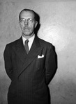George A. Kloop is heading a new division of the United States War Assets Administration (W. A. A.). He has several years experience marketing commercial and industrial machinery. The new division will handle the creation of capital and producer's goods. Mr. Kloop is shown standing against a wall, dressed in a double breasted pinstripe suit.