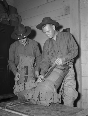 Here are a couple of those packs that are due to develop sore back muscles for a lot of foot soldiers when the Louisiana maneuvers begin for the Third Army. Shown here making final inspections of their packs at the Page Street armory are two members of Company D, One Hundred and Eleventh Medical Regiment, Louis Klimist (left) and Fred Bishop.