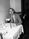 Sherwood Norman is a field consultant with the National Probation Association in New York, New York. He is visiting Fort Worth, Texas, to confer with officials of the Council of Social Agencies on the detention of juveniles. Mr. Norman is shown sitting at a table, drinking a cup of coffee. He is dressed in a suit.