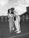 Texas Christian University spectator and drum major F. R. Woodward of Odessa, Texas kissing Miss Helen Marie Brown of San Angelo, Texas during the Texas Christian University (T. C. U.) vs. University of Arkansas football game.