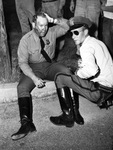 A Fort Worth Police Officer was involved in a car crash Saturday afternoon. Sitting on a curb, left to right, are Patrolman R. G. Brown Junior and his partner T. W. Curtis. Officer Brown suffered head lacerations and bruises when his motorcycle collided with an automobile. More dazed than hurt, the officer is waiting for an ambulance to take him to St. Joseph's Hospital. Both officers are dressed in their police uniforms. Published in the Fort Worth Star-Telegram morning edition, October 6, 1946.