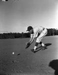 Shorty Lewis, amateur baseball player, seen catching a ground ball on the baseball field in his uniform.