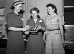 Leaders with the Girl Scouts are meeting to discuss troop activities. Pictured left to right are Mrs. Sam Gardner, Miss Ruth Mulkey, and Mrs. B. B. Longacre. Mrs. Gardner is the leader of Brownie Troop 39. She is dressed in a hat, button-up blouse, and a skirt. Miss Mulkey is a Girl Scout training advisor for the New Mexico-Oklahoma-Texas region. She is explained weaving procedure to the women. She is wearing a button-up dress. Mrs. Longacre is the head of Brownie Troop 1. She is wearing a plaid, collared dress.