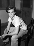 L. H. Brady is a 20-year-old cab driver in Fort Worth, Texas. On Sunday, just passed midnight, Mr. Brady was kidnapped by a passenger. He was forced to drive the cab to Brownwood, Texas, where the automobile stalled. Mr. Brady was beaten into semi-consciousness and the passenger hailed a passing automobile. The suspect was believed to be on his way to San Angelo, Texas. Mr. Brady is shown sitting in a chair, wearing a driving cap, t-shirt, and trousers.