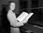 Mrs. J. O Garrett, staff assistant in the literature department of the Fort Worth Public Library, examines a rare copy of the Book of Common Prayer of the Episcopal Church, recently presented to the library in memory of Miss Zuman Douglas Dempsey by a group of her friends. Mrs. Garrett is holding the book and standing in front of an open display case. The book was given by J. P. Morgan to the estate of a man from New York. The edition is limited to 500 copies. Published in the Fort Worth Star-Telegram evening edition, October 15, 1946.