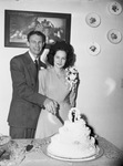 Mr. and Mrs. Raymond B. Huyge cutting the wedding cake. The bride is the former Miss Frances Faye Clark, daughter of Mr. and Mrs. H. M. Clark of Roswell, New Mexico. Mr. Huyge is the sone of Mrs. V. C. Shamburger and Mr. R. B. Huyge, both of Fort Worth. The couple will reside in Fort Worth after a trip to New Orleans. Mr. Huyge is wearing a stripped suit and Mrs. Huyge is wearing a belted dress with corsage and hat. Published in the Fort Worth Star-Telegram morning edition, October 16, 1946.