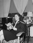Miss Jean Colwell is going to Japan as a civil service worker. She has completed packing her wardrobe and is awaiting orders to sail to Japan. Included in the year's supply of clothes she is taking are a fur coat, a fox fur cape, a fur evening jacket and two silver fox scarves. The trunk is packed behind her as she sits in a chair and reads a book. She is reading Thirty seconds over Tokyo by Ted W. Lawson. Published in the Fort Worth Star-Telegram evening edition, October 16, 1946.