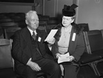 Reverend E. B. Surface, pastor of first Presbyterian Church of Abilene, Texas, with his wife, look over a program at Hemphill Presbyterian Church. Reverend Surface is retiring moderator of the Synod which is meeting jointly with the synodical of Texas Presbyterian U.S.A. at Hemphill Presbyterian Church. He has been in the ministry for 55 years. He will be succeeded by Reverend Harry Sorrels, associate minister of City Temple, Dallas. Published in the Fort Worth Star-Telegram morning edition, October 16, 1946.