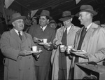 Officials and friends enjoy the barbecue in Irving, Texas at the formal opening of Humble Pipe Line Company's gasoline line. They are left to right, Fred D. McMahon, O. R. Smith, Harry Lingle and A. E. Pecore. All are Houston officials of Humble Pipe Line Company, except Smith, president of the Smith Construction Company, Fort Worth, which built the line. They are standing next to each other holding their beverage and plates of barbecue, and enjoying in conversation. Published in the Fort Worth Star-Telegram morning edition, October 16, 1946.