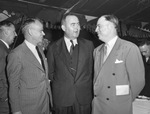 Officials and friends enjoy the barbecue in Irving, Texas at the formal opening of Humble Pipe Line Company's gasoline line. In the sales end of the gasoline business are left to right, E. W. Berry, Abilene, Texas, district manager; Frank Watts, Houston, Texas, sales manager, and Roy M. Nagle, Fort Worth, Texas manager. They are standing next to each other engaged in conversation. Published in the Fort Worth Star-Telegram morning edition, October 16, 1946.