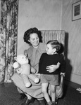 Mrs. Patricia Corson and young son, Michael from England are visiting Fort Worth with her deceased husband's parents, Mr. and Mrs. R. W. Heerlein. Her American husband, Corporal Michael William Corson, was killed while on an intelligence mission in Sicily. Mrs. Carson is sitting in a rocking chair hold a checkered teddy bear "Mimi" for her 2 1/2 year old son, Michael as he looks on. Published in the Fort Worth Star-Telegram morning edition, October 17, 1946.