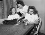 Young Women's Christian Association (YWCA) Y-Teen Department associate director Miss Jean Van Horn (center) helps two Rosemont Junior High School pupils in handcraft classes at the Y. They are Coral Dane Coughran (left), daughter of Mr. and Mrs. M. A. Coughran, and Carol Bradford, daughter of Mr. and Mrs. B. R. Bradford. The girls are sitting at the end of a table working on crafts. Miss Van Horn instructs Coral Dane on her projects with textile. Published in the Fort Worth Star-Telegram evening edition, October 17, 1946.