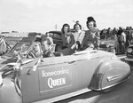 Texas Christian University pre-football game parade with Miss Poddy Jones (center), homecoming queen of Eldorado, Texas and attendants Miss Jeanne Webb (left) of Waxahachie, Texas and Miss Betty Doan of Greenville, Texas. In front are Darrell Tipps and Jim Erwin, the driver. The girls are wearing hats and mum corsages pinned to their clothing.