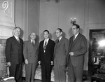 Prudential Life Insurance Company executives shown with Fort Worth Mayor Roscoe L. Carnrike, second from left, were among 17 greeted on their arrival in Fort Worth on a statewide tour. Left to right, Paul Bestor, vice president; Mayor Carnrik; Carrol M. Shanks, president; Caleb Stone, vice president of Bond department; and G. H. Chace, vice president, Ordinary Agencies department. The men are standing next to each other. Published in the Fort Worth Star-Telegram evening edition, October 19, 1946.