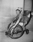 A few years ago 26-year-old Wesley Engquist decided that paralysis of his legs suffered as a child wasn't going to narrow his horizon and keep him confined to his home. He propelled himself into Fort Worth in his dusty wheel chair, making a total of 4,300 miles he has traveled since August 15 on his latest tour of the country. Starting from his home in Fremont, Nebraska, Engquist has visited Idaho, Wyoming, Oregon, California, Arizona, New Mexico and Texas on his trip, which is the 16th such junket he has made since taking to the highways in his wheel chair. Engquist usually gets picked up by truck drivers before he gets very far along the highway. His longest stretch wheeling himself along by hand on this trip was 165 miles without a lift. While in Fort Worth he is visiting his brother, Oliver Engquist. In this picture, he is sitting on a wheel chair and pose for a picture. Published in the Fort Worth Star-Telegram morning edition, October 22, 1946.