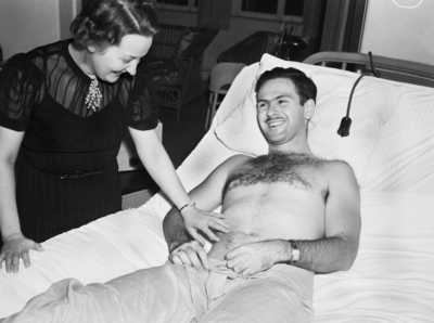 Mrs. Carl Deakins standing over Amon Carter Jr., who is seen in a hospital bed. Mrs. Deakins appears to be examining Carter's stitches.