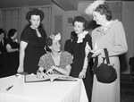 Communications Club. Bosses' Dinner. Mrs. Edwin T. Phillips, Chamber of Commerce department manager signing register. Left to right, Mrs. Velma Landrum, Mrs. Phillips; Mrs. Maybell Criner and Mrs. Ann Moore.