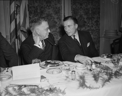 R. E. Harding, left, president of Fort Worth National Bank, and John W. Hanes, Undersecretary of the United States Treasury, sitting at a table at a banquet held for Mr. Hanes by Fort Worth, Texas bankers at the Fort Worth Club. Mr. Hanes was the principal speaker and was introduced by Mr. Harding. They are wearing suits. On the table are cups, plates and utensils. Published in the Fort Worth Star-Telegram evening edition, January 10, 1940.