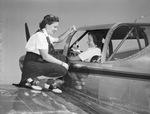 First in the nation to receive the torch-bearer rank in aviation are these two Texas Camp Fire girls from W. G. Fuller, member of the committee of awards of the Fort Worth Camp Fire Council. The girls are Pat Lane of Longview and student at Kilgore Junier College, and Billy Lowe, Paschal High School senior. In this picture, Pat Lane is inside of a plane and Billy Lowe is sitting on the plane's wings. They are looking at each other. Published in the Fort Worth Star-Telegram evening edition, October 29, 1946.