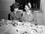 Dr. Esther Lloyd-Jones, right, of Columbia University, discusses a child guidance program with Mrs. Robert K. Campbell, secretary of the Board of Education, at a luncheon at Fort Worth Club. They are both sitting by a dining table. Published in the Fort Worth Star-Telegram morning edition, October 30, 1946.