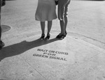 In the picture is "Wait on Curb for Green Signal" sign painted on downtown corners. Almost anywhere in the downtown area signs such as this served as reminders to pedestrians that cars seldom hit persons who stand on the burning until traffic signals change. Published in the Fort Worth Star-Telegram evening edition, October 29, 1946.