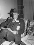 John C. Day of Tulsa, secretary and manager of the Western Petroleum Refiners Association. He is sitting on a chair and reading. Published in the Fort Worth Star-Telegram morning edition, October 30, 1946.