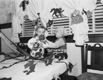 Freddie Notley, right, son of Mr. and Mrs. Fred Notley, offers a bite of his red-faced apple to Camille Bridget, daughter of Captain and Mrs. H. B. Bridget, They are sitting by a table and wearing Halloween costumes. There are Halloween decorations around the house. Published in the Fort Worth Star-Telegram evening edition, October 31, 1946.
