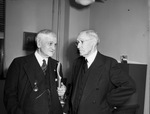 Two retired bishops of the Methodist Church are taking an active interest in the 81st annual session of the Central Texas Conference. They are, from left to right, Bishop Edwin Holt Hughes of Chevy Chase, Maryland and Bishop John M. Moore of Dallas, Texas. They are shown standing in a room and talking. Both are wearing suits and ties. Bishop Moore is wearing eyeglasses. Bishop Hughes is conference preacher. Bishop Moore is renewing many friendships among clerical and lay delegates. Published in the Fort Worth Star-Telegram morning edition, October 31, 1946.