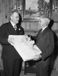 Reverend (Rev.) Forrest C. Feezor (left) was presented with a silver tray at Broadway Baptist Church when he was honored at a farewell party. The gift was presented by E. B. Ingrum, chairman of the Broadway board of deacons. Reverend (Rev.) Feezor will start his new role as a pastor of First Baptist Church at Waco November 10. Published in the Fort Worth Star-Telegram evening edition, October 31, 1948.