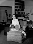 Miss Betty Lindsey is a Fort Worth, Texas debutante. She is the daughter of Mrs. J. Mac Thompson. Miss Lindsey is shown sitting on a chaise chair in the study of her home. She is wearing a button-up blouse and a skirt. There is a tall built-in bookcase in the background. Published in the Fort Worth Star-Telegram morning edition, November 10, 1946.