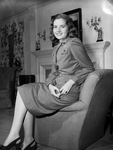 Miss Lola Katheryn Thompson is a Fort Worth, Texas debutante. She is the daughter of Mr. and Mrs. James M. Thompson. Miss Thompson is shown sitting on the arm of a chair inside her living room. She is wearing a button-up blouse, skirt, and a belt. There is a fireplace in the background. Published in the Fort Worth Star-Telegram morning edition, November 10, 1946.