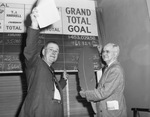 The broad grins of C. W. Wofford (left), Community Chest president, and Homer Covey, one of the three leaders in the chest's annual drive for funds. They announced Thursday at a luncheon that Fort Worth had gone over its $453,029 quota with contributions reaching $468,829. They are shown standing near a board that shows "Grand Total Goal". Both are dressed in suits and ties and looked happy. Published in the Fort Worth Star-Telegram, morning edition, November 1, 1946.
