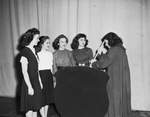 Texas Wesleyan College (TWC) Halloween Carnival. Carolyn Clark (right), Junior from Ranger, is playing the role of "wicked old witch". She is shown stirring her brew before deciding that Jeanne Johnson (fourth from left), freshman from Riesel, be crowned as queen of the 1946 Halloween Carnival. Other class representatives are, left to right, Jo Ann Gunn, senior from Granbury; Deanie Archer, junior from Granbury, and Margaret Hailey, sophomore from Cisco. Published in the Fort Worth Star-Telegram morning edition, November 1, 1946.