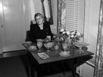 Mrs. R. D. Evans posing with her collection of glassware. The collection includes cups, saucers, bowls, cake plates and vases. Mrs. Evans is dressed in a dark blouse and a blazer.