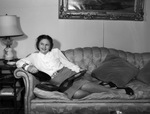 Miss Francis Ann Harrell is a Fort Worth, Texas debutante. She is the daughter of Mr. and Mrs. T. J. Harrell. Miss Harrell is shown relaxing on a couch as she looks through her record collection. She is wearing a button-up blouse, skirt, and a belt. There is an end table beside the couch and a painting hanging on the back wall. Published in the Fort Worth Star-Telegram morning edition, November 10, 1946.