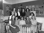 The Fort Worth Lions Club is running a Pedestrian Safety Campaign at Texas Wesleyan College. A group of female students volunteered as "Dolly Dimwits" for the "Watch While You Walk Campaign". Participants posed in a group picture are left to right on the front row, are Ramona Gunn, Faye Johnson, Elaine Lovelace, Mrs. D'Arcy Reid, and Veta Fuller. On the back row are Doris Renfro, Virginia Powell, Ruth Garner, Laverne Lake, Carolyn Clarke, Jurine Laseter, and Jeanne Johnson. There is a gallery wall of sculpture photographs behind the group. Published in the Fort Worth Star-Telegram morning edition, November 2, 1946.