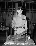 Herman Gutkowski is a veteran of more than four years of infantry service. He is the first veteran to graduate from the combination electric and acetylene welding course at the Technical Institute. The course lasted thirty-nine weeks which included techniques on both light and heavy materials, covers layout, and template design work and fabrication of pipe and structural steel. Gutkowski is the son of Mr. and Mrs. Joe Gutkowski. He graduated from Laneri High School. He holds the Combat Infrantryman's badge, the Purple Heart, Presidential unit citation and five battle star. Mr. Gutkowski takes a break from working on a steel plate. He has a torch in hand and safety goggles on his head. There are now 1,375 veterans enrolled at the Technical Institute. Published in the Fort Worth Star-Telegram morning edition, November 3, 1946.