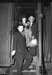 Knights Templar, Worth Commandery commander L. B. Weinman (foreground) with Sir Knight and Mrs. Ed Alexander. They are stepping out of a train car. Mrs. Alexander has her coat draped over her left arm and Sir Knight Alexander is carrying a piece of luggage and holding a cigarette in his left hand.