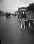 The Fort Worth Lions Club is running a Pedestrian Safety Campaign at Texas Wesleyan College. One of the students participating in the campaign is Miss Laverne Lake. She is demonstrating the dangers of jay-walking - crossing the streets in the middle of the block instead of at the intersection. Miss Lake is wearing a dark blouse and a pleated skirt. Published in the Fort Worth Star-Telegram morning edition, November 7, 1946.