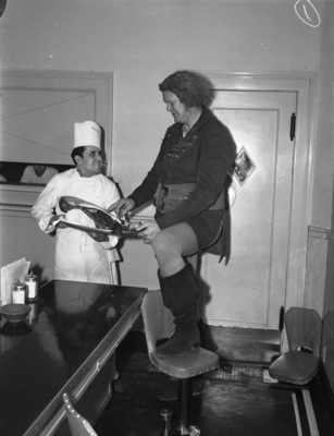 J. D. Ballard, ballyhoo man for "Gulliver's Travels," motion picture screening at the Worth Theater, receiving his meal from Frank Vallet, chef at the Worth Hotel. Mr. Vallet is wearing a chef coat, apron and hat and is holding a five-pound roast. Mr. Ballard stands 8 feet 2 inches tall, weighing 366 pounds, is standing with one foot raised on a chair. He is wearing movie costume of shirt, belt, pants and boots. Published in the Fort Worth Star-Telegram morning edition, January 10, 1940