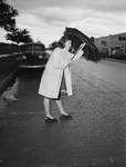 The Fort Worth Lions Club is running a Pedestrian Safety Campaign at Texas Wesleyan College. One of the students participating in the campaign is Freshman Jeanne Johnson. She is demonstrating the "umbrella ostrich" where the bird buries its head in his umbrella and can't see where he's heading. Miss Johnson is wearing a rain coat and holding an umbrella shielding her face from having a good view of the street that she is crossing. Published in the Fort Worth Star-Telegram morning edition, November 4, 1946.