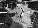 The Texas Christian University (T. C. U.) Horned Frogs are hosting the visiting University of Oklahoma Sooners at Amon G. Carter Stadium. Fans are braving the rain to attend the college football game. Watching the game, left to right, are E. E. Cavender and his nine-year old niece, Gladiene Warren. Mr. Cavender, of Fort Worth, Texas has been a T. C. U. backer for the last ten years. He is dressed in a hat, suit, and a coat. Gladiene is attending her first football game. She is wearing a rain poncho and a hood. The Frogs lost the tight mud-battle 14-12.