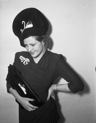 The National Fashion Exhibitors opened its Fall market at the Hotel Texas. Miss Loyce Nelson is modeling some of the accessories from the show. She is wearing a dress and a pompadour style hat of soft black velvet with white and pastel hand embroidered swan. The matching bag is edged with a soft wide ruffle.