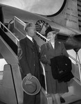 Mr. and Mrs. Joseph Leonard returning from a railroad trainmen's convention. They are stepping off a Delta Airlines plane. Mr. Leonard is wearing a suit and holding his hat in his right hand. Mrs. Leonard is wearing a blouse, blazer, skirt, hat and eyeglasses. She is carrying a coat in her hands.