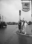 The Fort Worth Lions Club is running a Pedestrian Safety Campaign at Texas Wesleyan College. Some of the students participating in the campaign are shown waiting to cross the street, standing underneath a Mobilgas sign. One of the students, Doris Renfro, is demonstrating the "barger". She is elbowing her way through the crowd so she can be the first across the street when the traffic signal changes. She is wearing a blouse, dark blazer and a matching skirt. Published in the Fort Worth Star-Telegram evening edition, November 11, 1946.