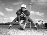 Dick Norris is the steady center on the Wichita Falls High School football team. He is also one of three team captains. The Coyotes are preparing for an upcoming game against the Graham Steers on November 28. The winner will be named District 2-AA champions and advance into the playoffs. Norris is shown on the football field, practicing the snap. He is wearing a football uniform, number 48.